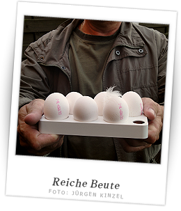 ein kleiner E-Herd und zwei Pfannen stehen schon parat. Flott werden die Eier noch für die Statistik gezählt,